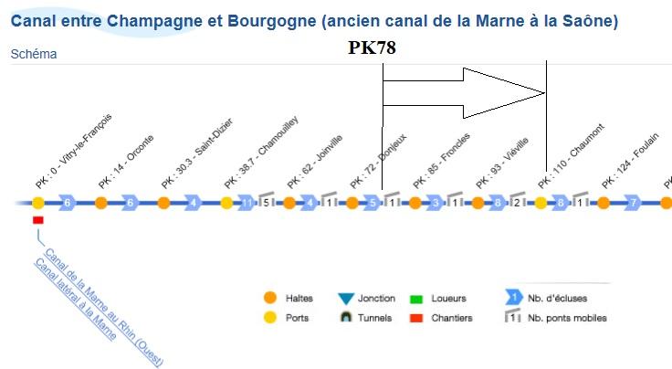 - Canal Champagne Bourgogne: PK78 à PK110: 32 kilomètres parcourues, 13 écluses et 4 ponts-levis franchis